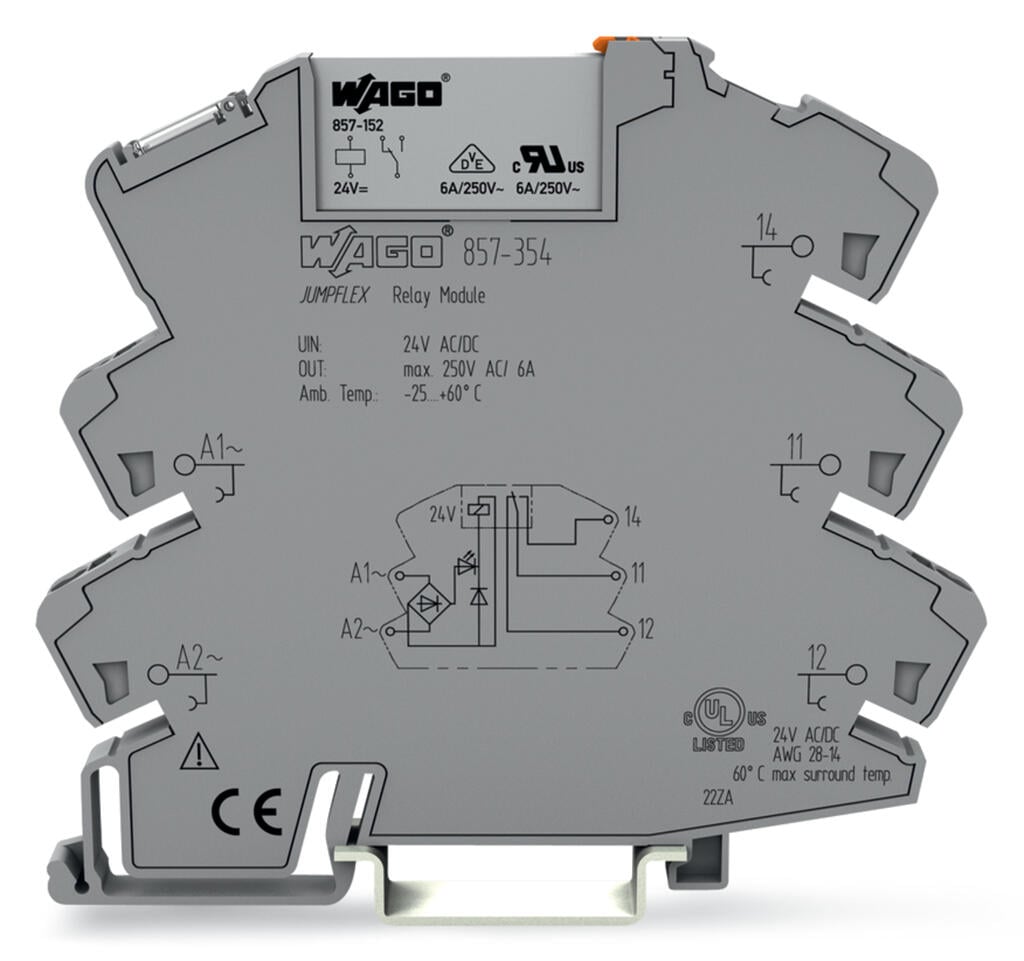 The WAGO 857-354 Relay Module 24V is a slim, DIN-rail mount interface designed for versatile AC/DC control applications. It features a universal 24 V AC/DC coil input and one SPDT (changeover) contact rated for 6 A continuous current.